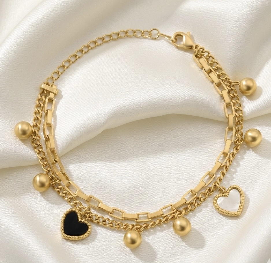 A layered chain bracelet featuring contrasting heart charms and polished gold spheres for a refined yet playful look.