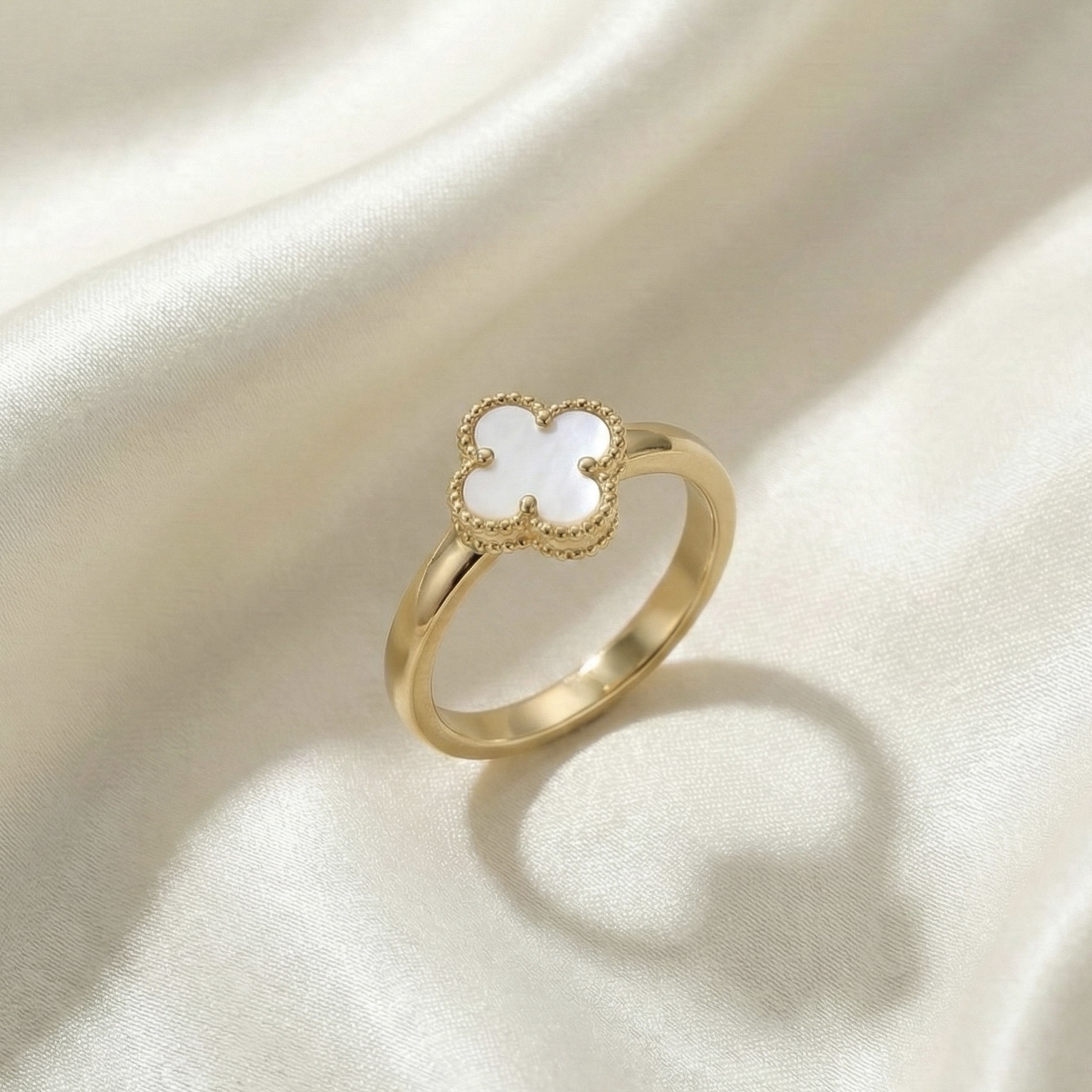 A timeless clover silhouette elevated in luminous white enamel and framed with intricate detailing in 18 carat gold. The polished band balances softness with structure, making it perfect for everyday elegance. Crafted to be anti-tarnish and hypoallergenic, this ring offers lasting shine and comfortable wear.