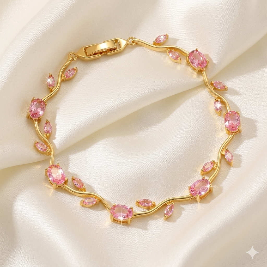 An elegant vine-inspired silhouette adorned with luminous blush pink stones set along fluid gold curves. The balanced oval and marquise accents create a soft yet refined sparkle. Designed to add feminine charm while maintaining a polished, contemporary finish.