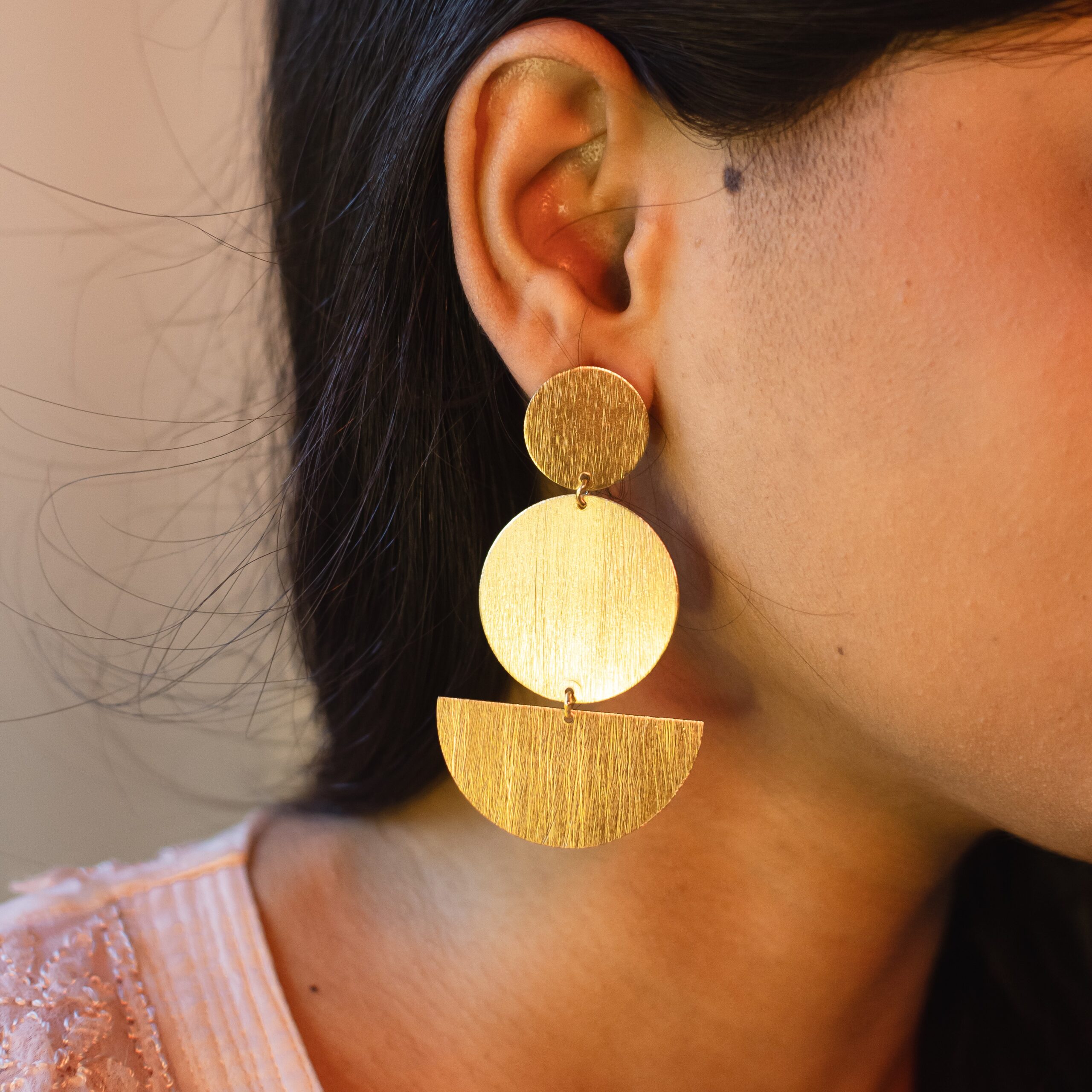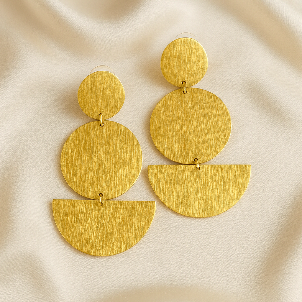 Inspired by the bold geometry of modernist art, these earrings bring together circles and semi-circles in a rhythmic, architectural composition.