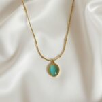 The Emerald Aura Necklace captures refined sophistication with its luminous green stone pendant, gracefully framed in 18 carat gold plating. The textured beaded chain adds a modern touch while keeping the design timeless. Crafted to be anti-tarnish and hypoallergenic, this piece is designed for long-lasting elegance and comfort. A versatile necklace that brings a subtle statement of color and luxury.