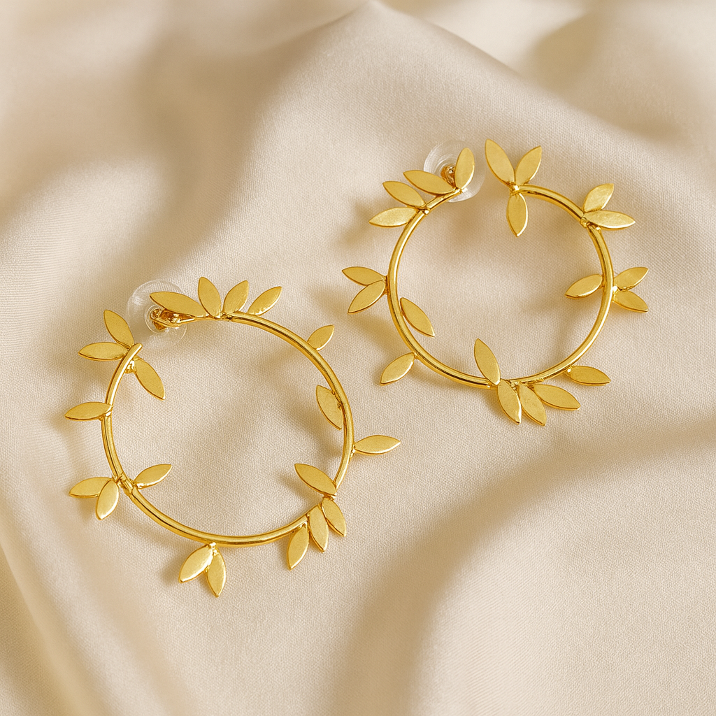 The intricate matte-gold leaf detailing set on a bold hoop base offers a unique statement while maintaining a refined and sophisticated appeal.