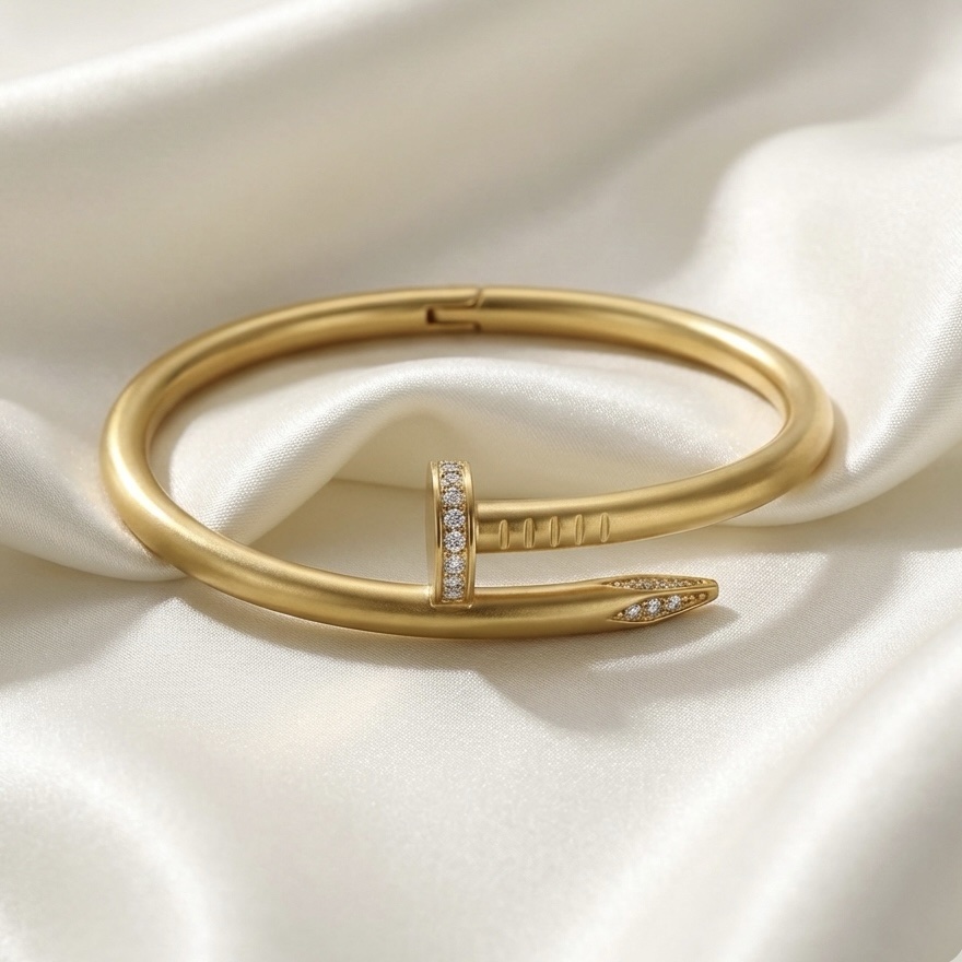 A playful yet refined design, the Little Luxe Nail Bangle reimagines the iconic nail silhouette in a delicate, child-friendly form. Smooth curves meet subtle stone detailing, creating a piece that feels both modern and timeless. Designed to sit comfortably on young wrists, it adds a gentle sparkle to every special moment. Finished in premium 18 carat gold plating for a soft, elegant glow.