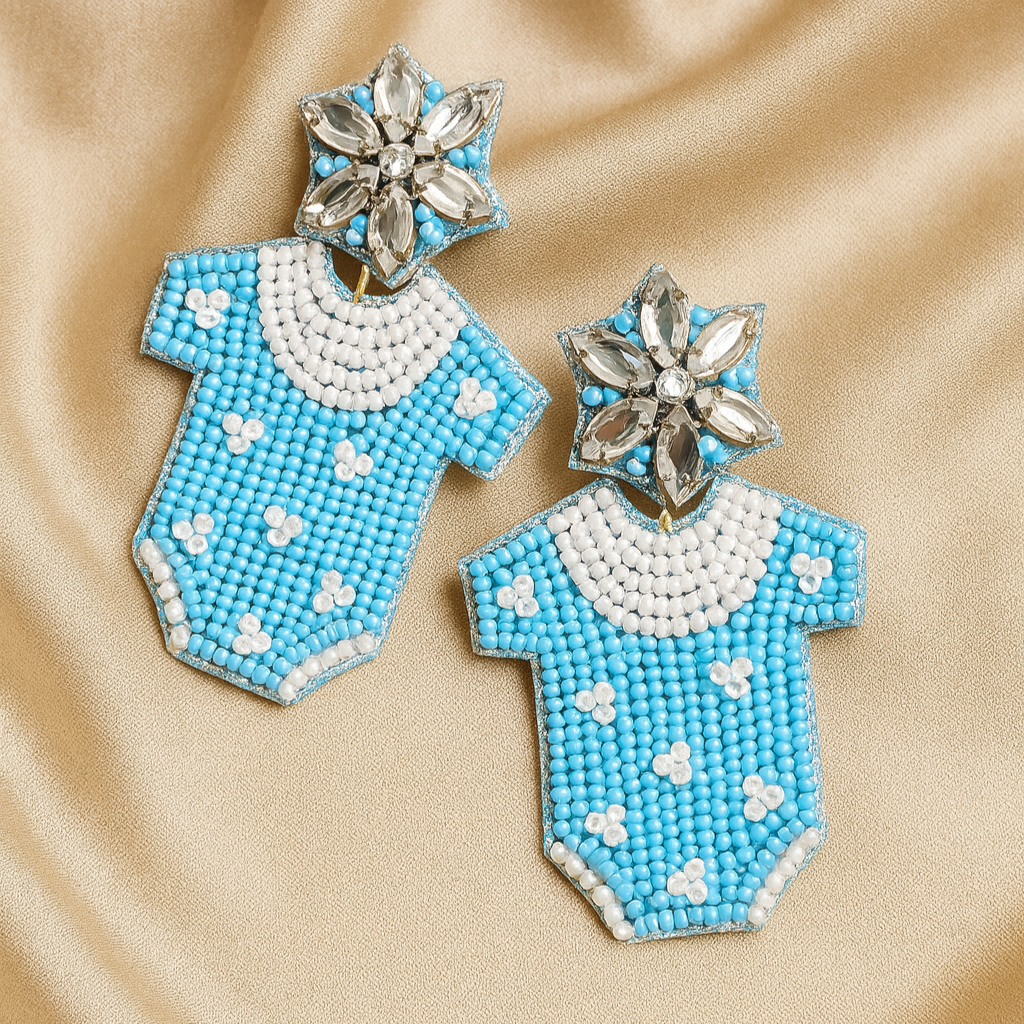 The vibrant pastel blue and delicate white bead detailing paired with a crystal-studded floral top makes this design a standout keepsake for baby showers, gifting, or celebrating motherhood with flair.