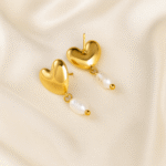 The sculpted golden heart paired with a single dangling pearl creates a timeless silhouette that feels both soft and statement-making.