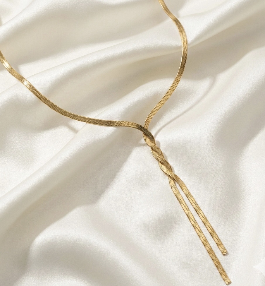 A fluid herringbone chain designed in a graceful lariat silhouette, finished with a soft knot detail that adds sculpted elegance. The sleek drape enhances the neckline with effortless sophistication, making it perfect for both layered styling and standalone wear. Modern, refined and minimal in its expression. Anti-tarnish and hypoallergenic, crafted for lasting shine and all-day comfort.