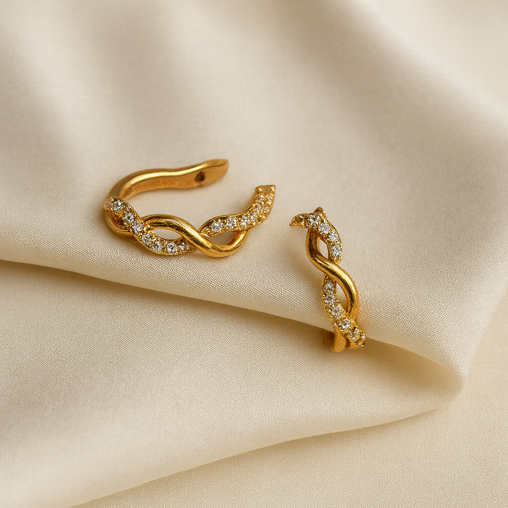 A delicate yet striking ear cuff designed to hug your ear without the need for piercing. The intertwined, wave-like design is studded with sparkling zirconia, giving it a refined and glamorous look. Lightweight and comfortable, it’s perfect for stacking with other earrings or wearing solo for a chic statement.